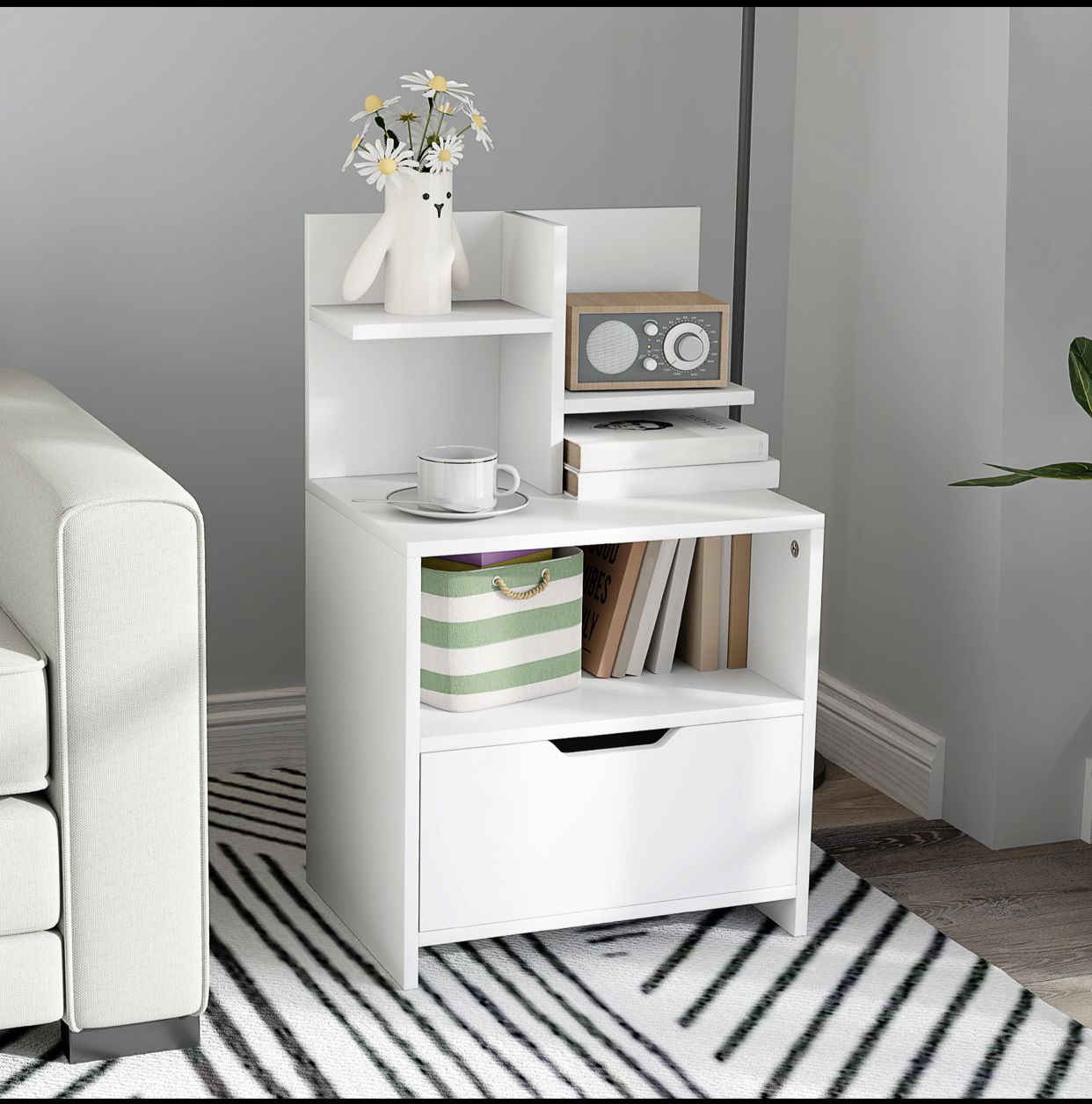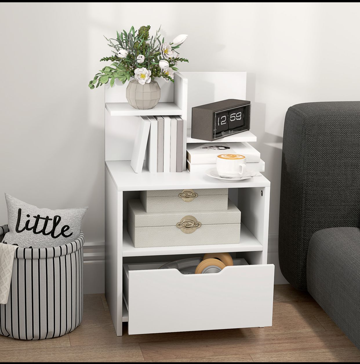 Optimisez votre espace de repos avec cette table de nuit au design organique et vertical. Son mélange harmonieux de blanc éclatant et de finitions effet bois crée un contraste chaleureux, idéal pour une chambre à l'ambiance cocooning ou scandinave. Ce modèle est particulièrement modulable dans son organisation : il s'élève en hauteur pour offrir plusieurs niveaux de rangement sans encombrer la surface au sol. Que ce soit pour exposer une lampe design sur le plateau supérieur, ranger vos lectures dans les étagères ouvertes ou cacher vos objets personnels dans le tiroir, chaque élément trouve sa place avec fluidité.