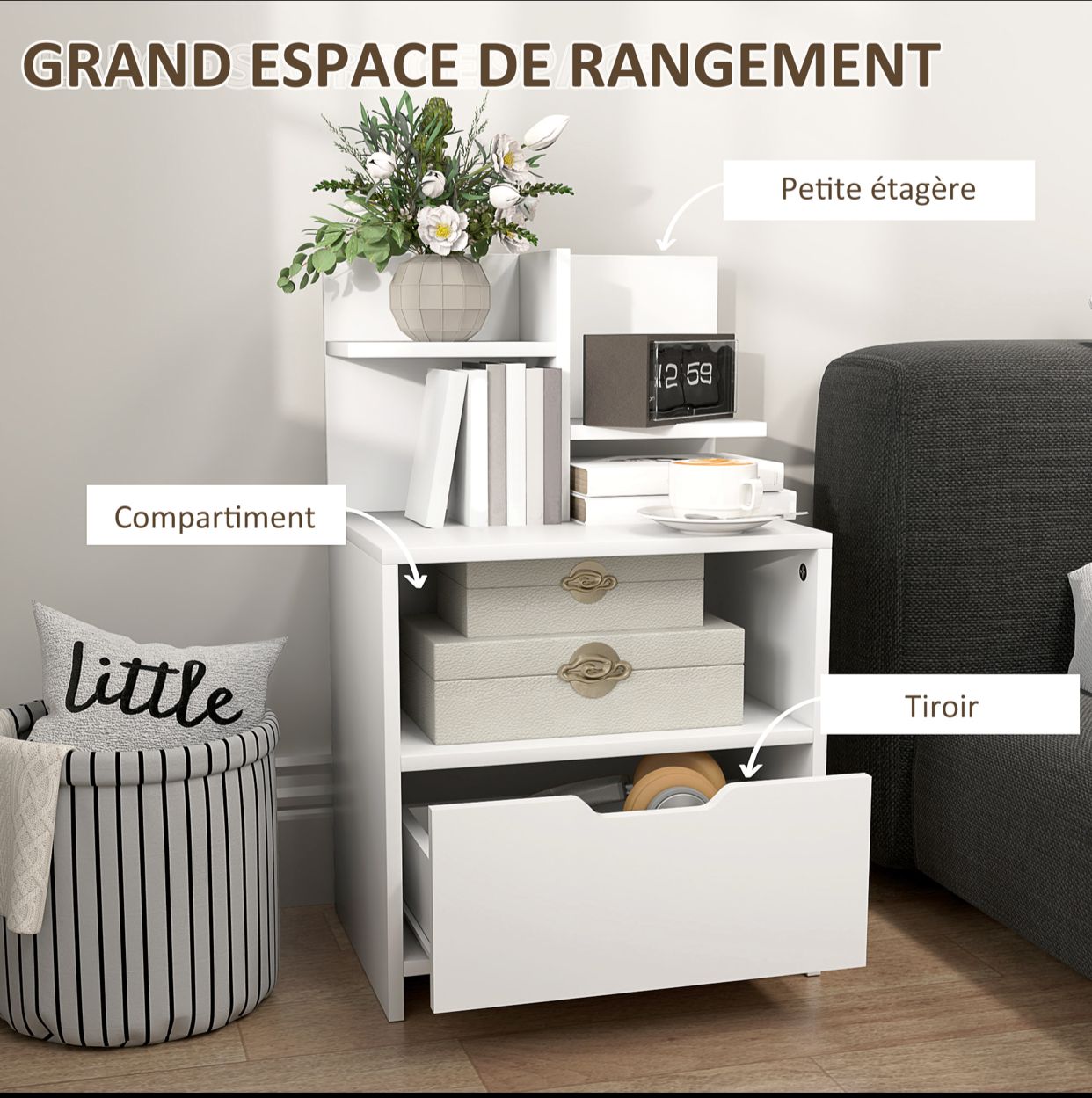 Table de chevet table de nuit avec tiroir, niche et étagères de rangement effet bois - blanc